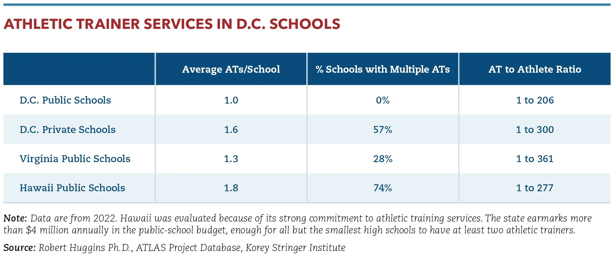 D.C. is not unique with its AT challenges. Rural and inner-city schools nationally have far less access to ATs than those in the suburbs. Finding athletic trainers to work odd hours and for the amount offered by schools is increasingly challenging. In recent years, the athletic training profession transitioned to require a master’s degree in order to be certified, meaning these students leave college with job opportunities in higher-paying industries than schools, where the sports financial model is backward. Budgets focus first on every aspect related to competition and only then allow for an athletic trainer, if there’s enough money.