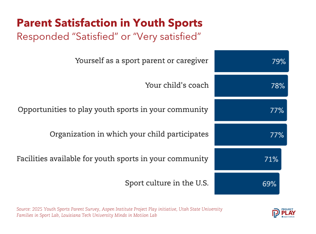 Youth sports parents generally appreciate the value of the institution. In the Institute’s survey, almost seven of 10 of them expressed satisfaction with sport culture in the U.S., Generally, parents expressed greater satisfaction with individuals and entities the closer they are to the family, including a 79% favorable rate for themselves as sports parents.