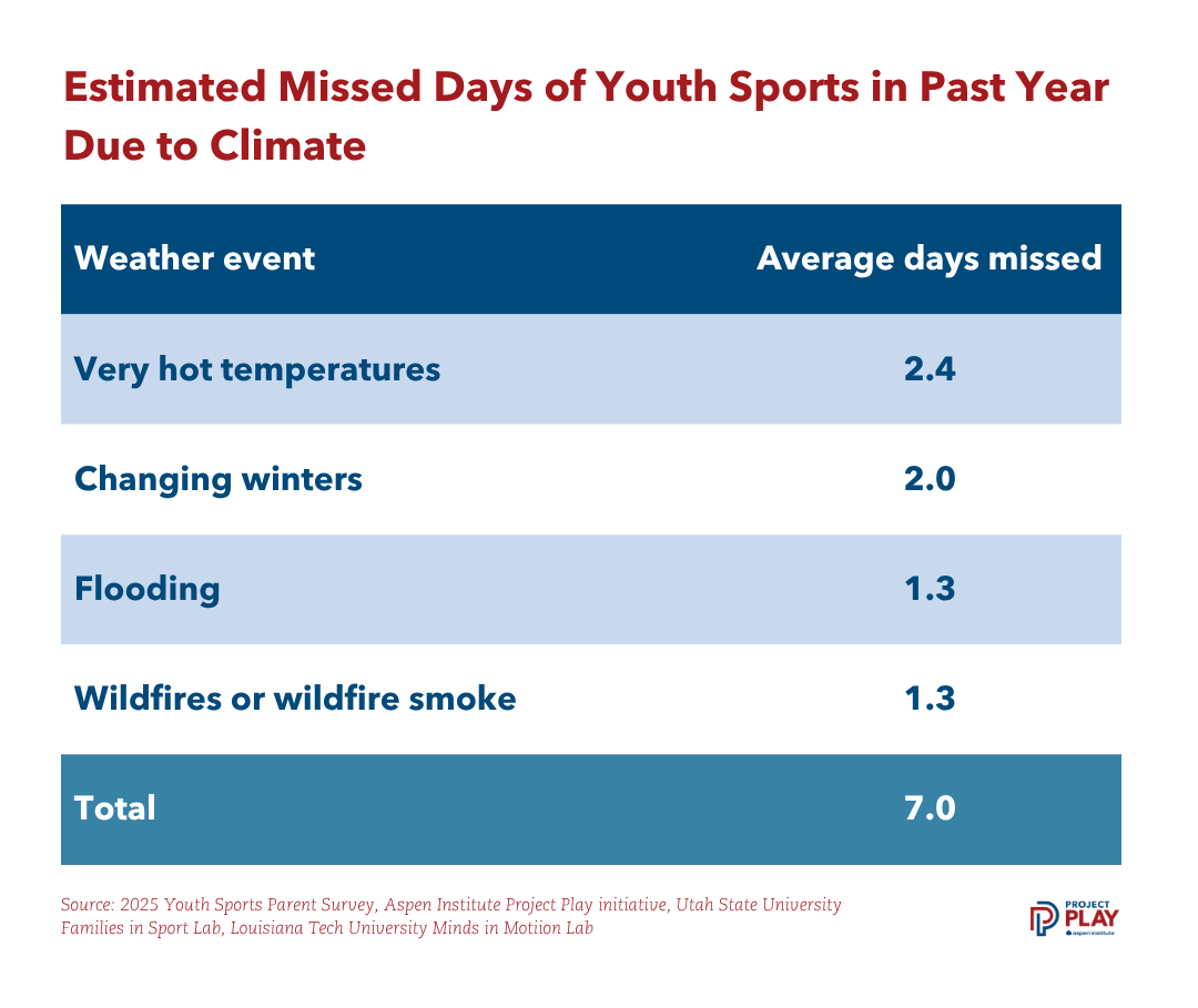 The Aspen Institute’s Project Play initiative partnered with Utah State University and Louisiana Tech University to survey youth sports parents, releasing in March a 148-page report that helped inform several sessions at 2025 Project Play Summit. Now, we’re analyzing key findings in depth. This fourth story in our year-long series examines the impact of climate change on youth sports.