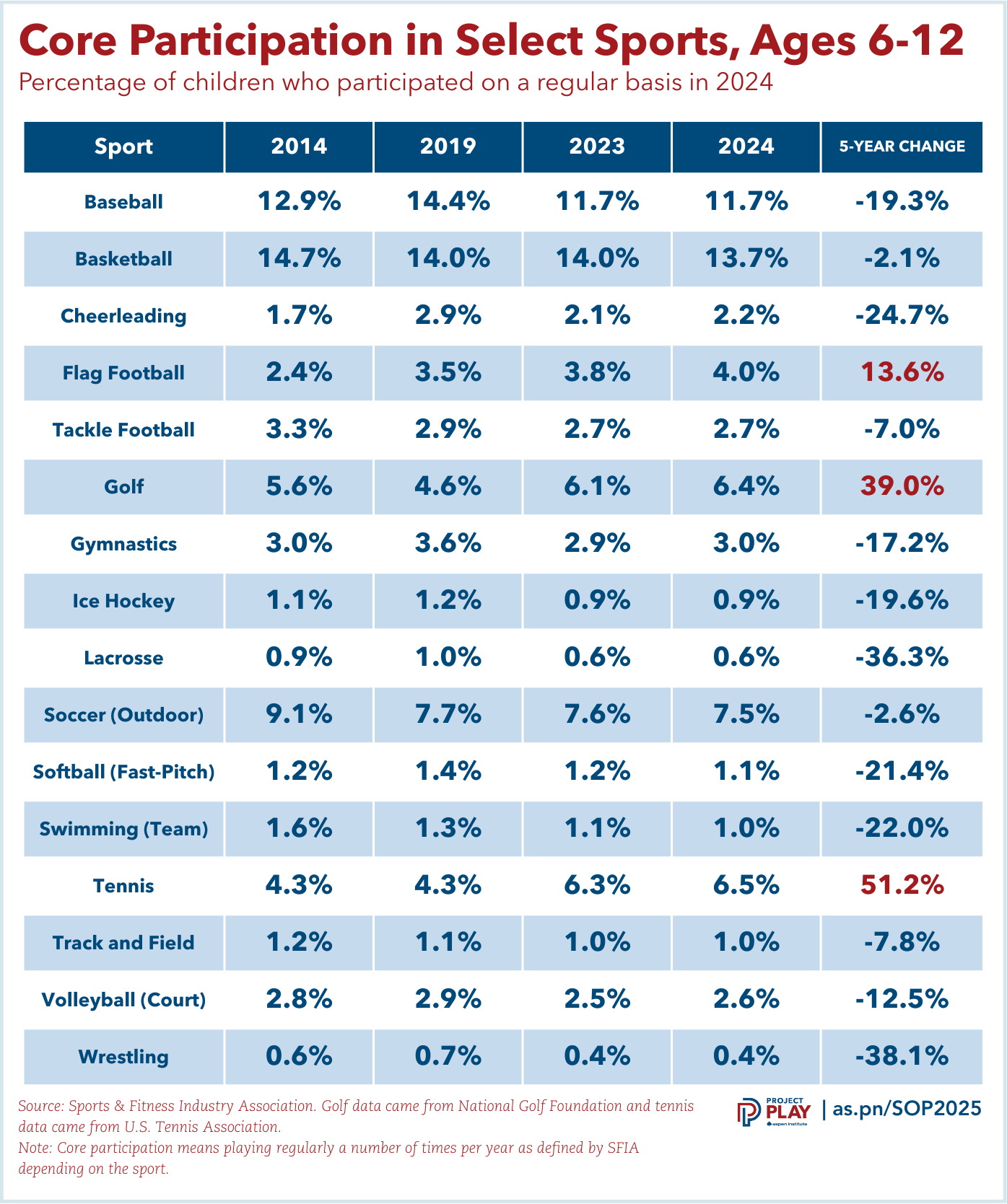 In the decades to come, we may view youth sports as two eras – before flag football exploded and after. We’re currently in the early stages. Consider what happened from 2019 to 2024: flag football was the only team sport tracked by SFIA that experienced growth in regular participation among kids ages 6-17. (Tennis and golf increased as individual sports through separate data shared with Aspen.)